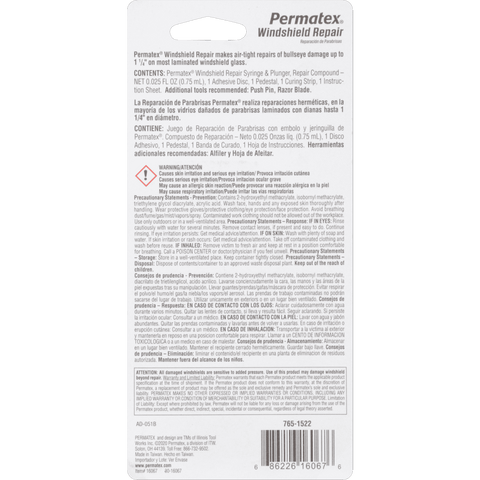 1. CONTENTS: Permatex® Windshield Repair Syringe & Plunger, Repair Compound NET 0.025 FL OZ (0.75 mL), 1 Adhesive Disc, 1 Pedestal, 1 Curing Strip, 1 Instruction Sheet. Additional tools recommended: Push Pin, Razor Blade.